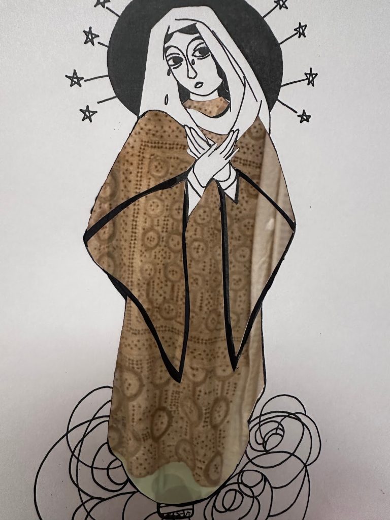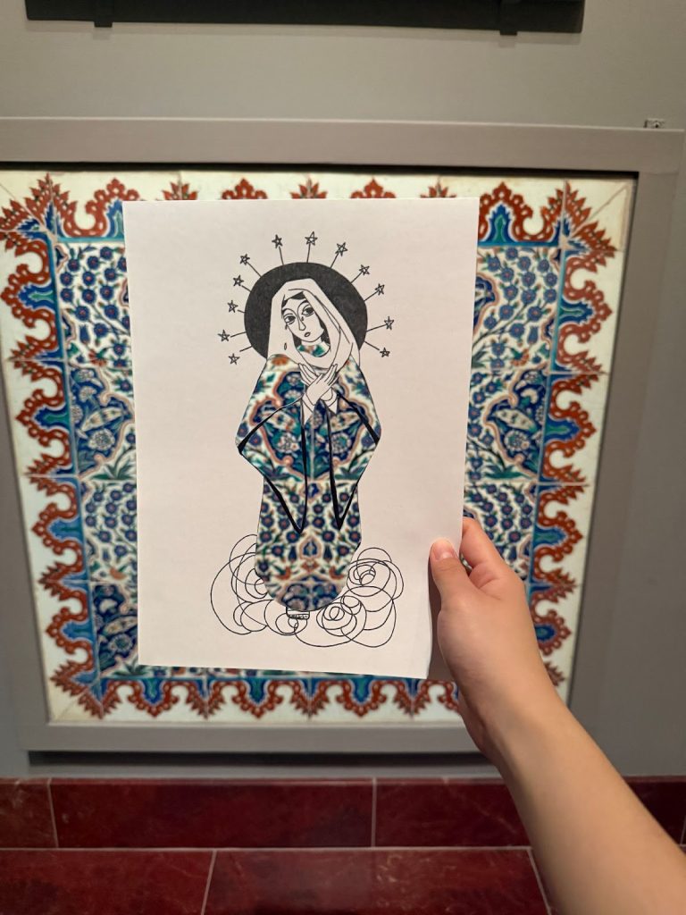Ali El-Chaer (they/he) created a walk through using the folk story of Joha and his donkey as a guide and to set the tone on cultural appropriation and erasure through the Arab/Islamic art wing. The viewer could use the blank Mary template as a comment on the absence of Palestinian textile/patterns. The use of Mary is also reflective of Ali’s Palestinian Christian background and the importance of her story as a Palestinian woman on a global scale and the Palestinian Christian identity being erased. Viewers were able to dress her up with various other patterns and materials encountered in the same wing and in other places of the museum.